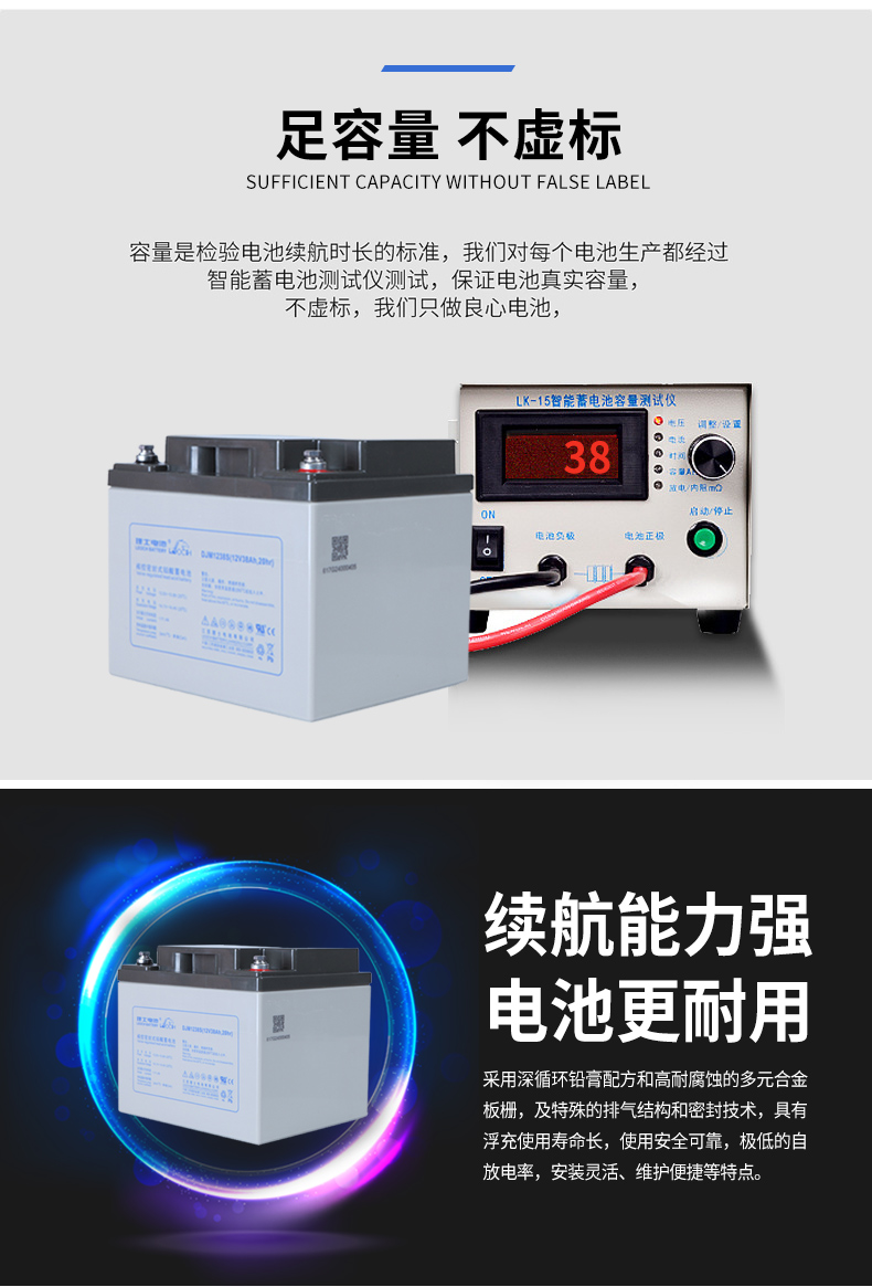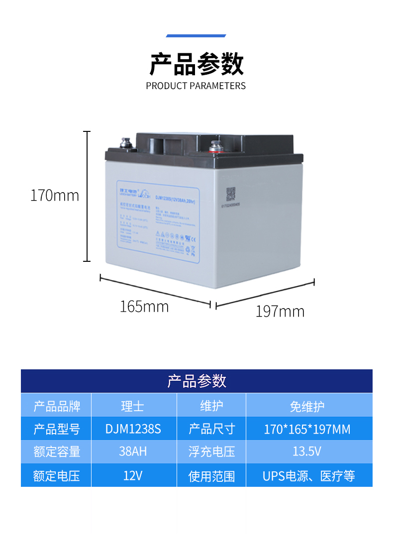 产品容量:38AH(千伏安)系列:AGM阀控式密封铅酸蓄电池-DJM端子类型:铜端子