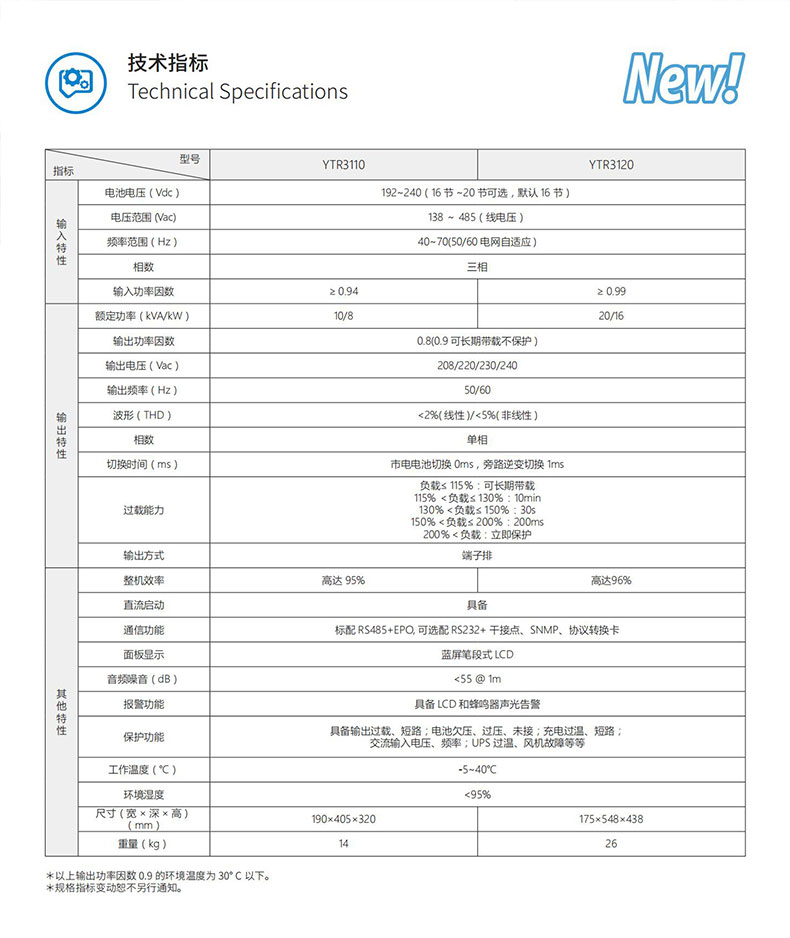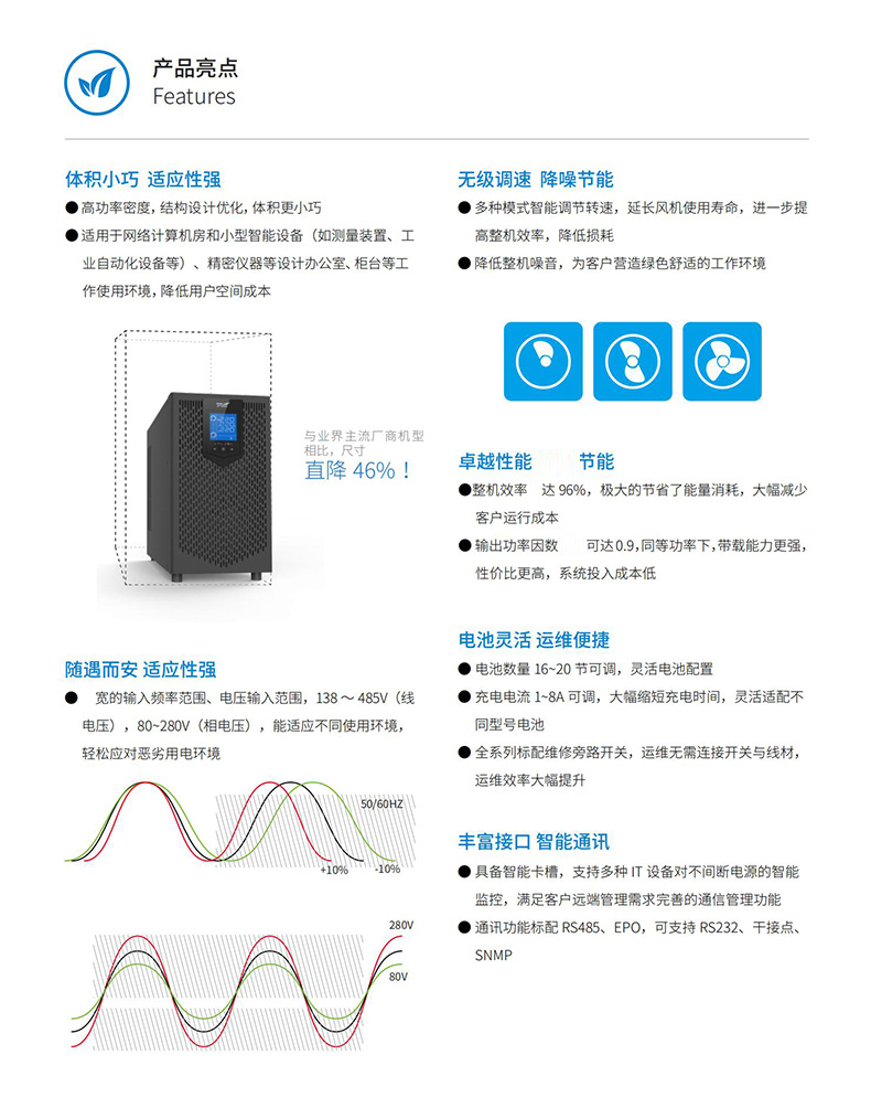● 通讯功能标配RS485、EPO,可支持RS232、干接点、SNMP