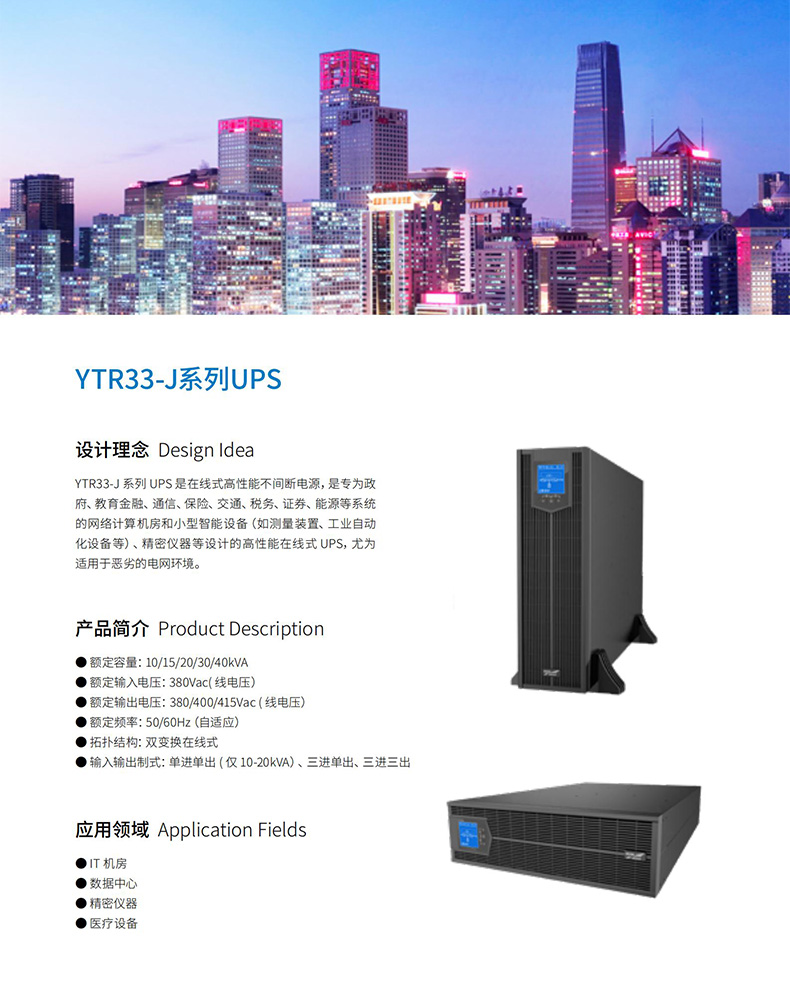 YTR系列三进三出UPS是正弦波在线式高性能不间断电源,是专为金融、通信、保险、交通、税务、军队、证券、能源、教育、政府、企业等系统的网络计算机房和小型智能设备(如测量装置、工业自动化设备等)、精密仪器等设计的高性能正弦波在线式UPS,尤为适用于恶劣的电网环境。