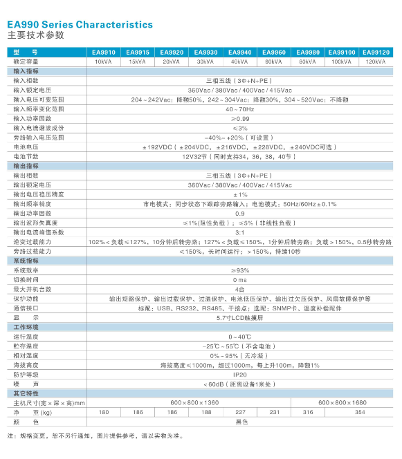 EA990系列10kVA-120kVA产品是采用全数字化控制技术设计的三进三出高端UPS电源。整机布局设计打破传统塔式机器设计思维,完全采用模块化设计理念,既保证了布局的紧凑性,又提高了系统的可靠性。 此系列产品电气性能优异,软硬件保护功能完善,能适应不同的电网环境,可以为各种负载提供安全可靠的电源保障。