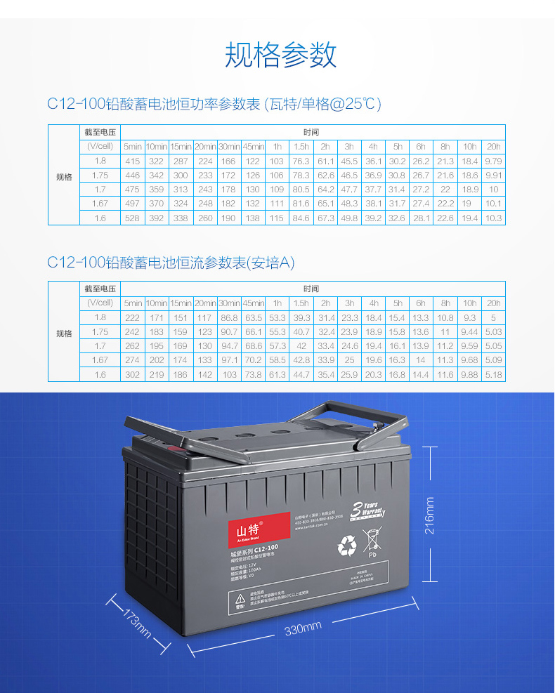 产品名称:山特C12-100Ah蓄电池正品保证。全国联保三年,全国范围可免费上门安装调试。