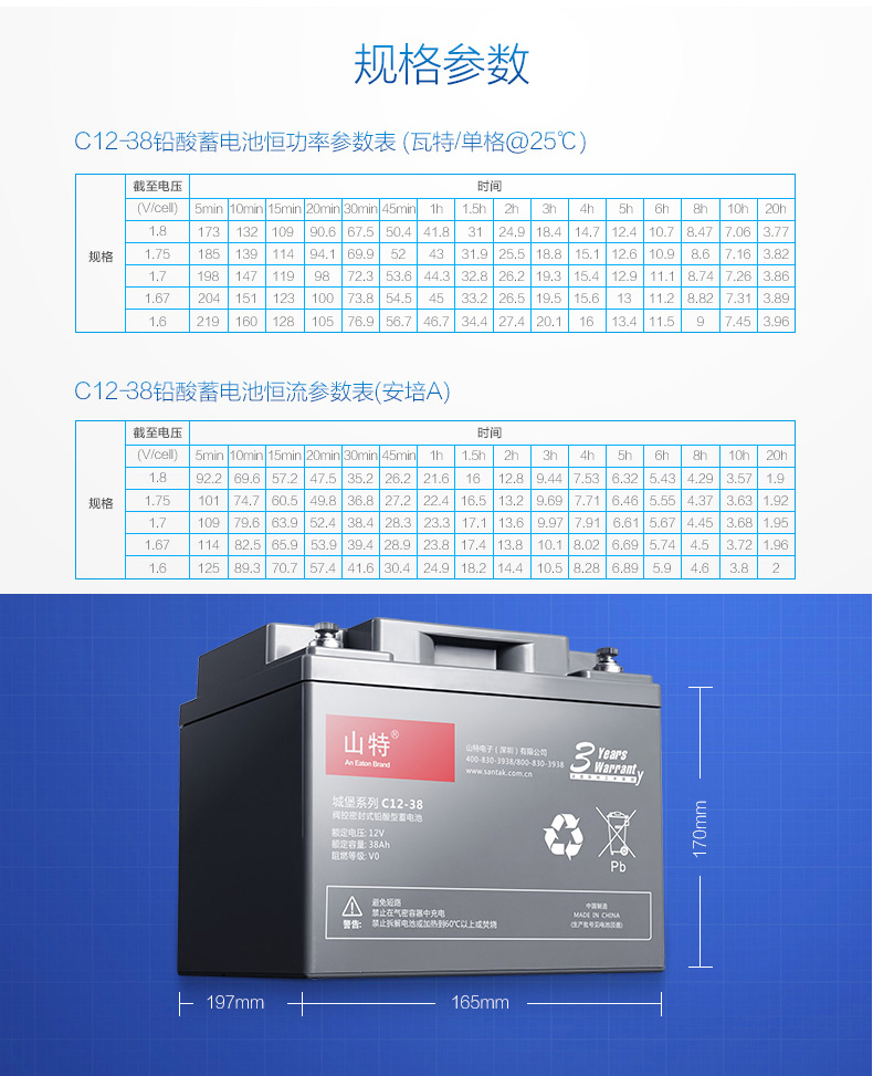 产品名称:山特C12-38Ah蓄电池正品保证。全国联保三年,全国范围可免费上门安装调试。