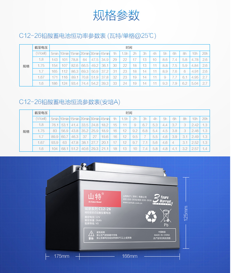 产品名称:山特C12-26Ah蓄电池正品保证。全国联保三年,全国范围可免费上门安装调试。