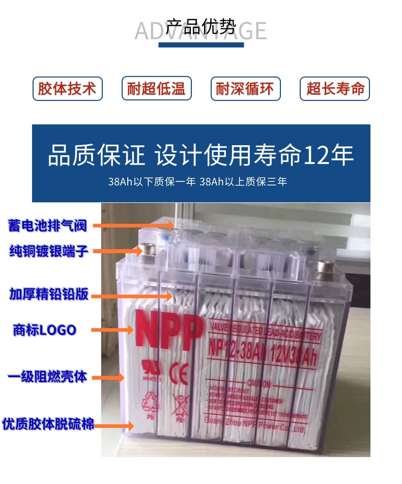 产品名称:NPP耐普NPG12-38 12V38Ah胶体蓄电池,正品保证。全国联保三年,全国范围可免费上门安装调试。